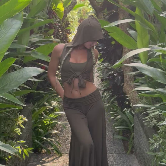 Named after the goddess of love and battle, this piece was designed for movement that feels like worship. Rooted in Norse strength and divine sensuality, the Freyja Pant flows with intention. Our Freyja Pant is lightweight, and draped with just the right amount of drama. These pants hug at the waist with optional rise, and cascade with split-leg freedom—inviting sway into your moves.